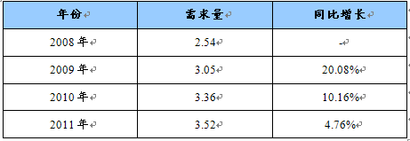 2008-2011年我国220KV及以上变压器的需求量预测表 单位:亿千伏安