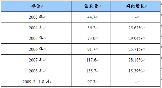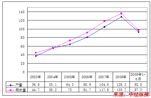 2003-2009年8月我国大型锻件供需平衡曲线图 单位:万吨
