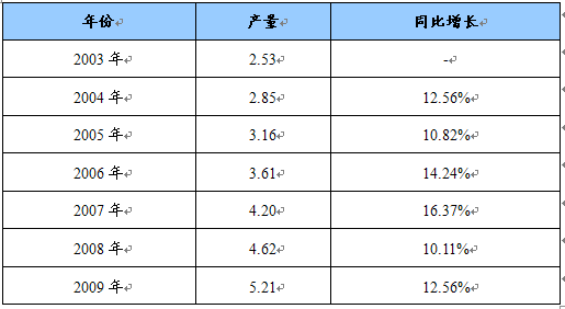 2003-2009年中温淀粉酶产量及同比增长统计表 单位:万吨