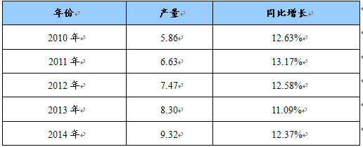2010-2014年中温淀粉酶产量及同比增长预测表 单位:万吨