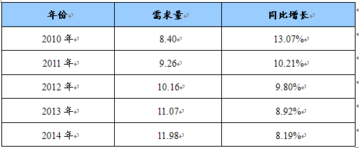 2010-2014年中温淀粉酶需求量及同比增长预测表 单位:万吨