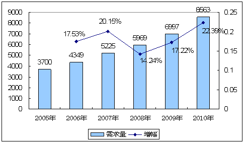2005—2010年定量给料机产品市场需求及预测图