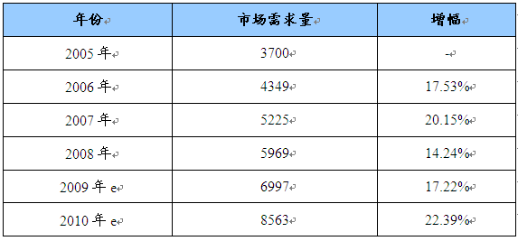 2005—2010年定量给料机产品市场需求及预测表