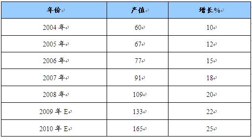 2004-2010年我国飞机模具产量规模及预测(亿元)