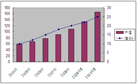2004-2010年我国飞机模具产量规模及预测增长图(亿元)