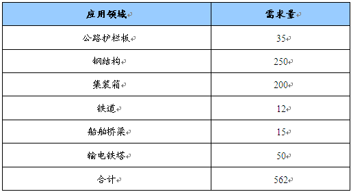 目前的国内冷弯型钢需求约为597.2万吨,到“十一五”期间则将增长为845万吨。其中其中公路护栏板目前需求约为35万吨,“十一五”期间将继续发展,增长为38万吨;钢结构用钢需求则将由目前的200万吨,增长为250万吨;汽车用钢需求量也将继续放大,将由目前的70万吨增长为100万吨;集装箱用钢需求将由目前的150万吨增长为200万吨;钢模板和脚手架由于市场已经基本饱和,需求难以放大,仍将继续保持110万吨;由于火车提速等原因,铁道汽车用钢的需求量也将放大,由目前的8万吨,将增长到12万吨;船舶桥梁用钢需求将由13万吨增长到15万吨,钢板桩我国目前市场尚未开发完全,目前国内仅一万吨的产量,并且基本都用于出口。