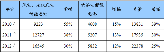 2010-2012年我国储能电池市场容量预测表