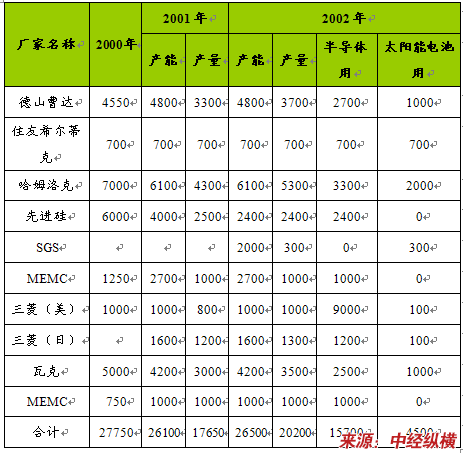 2000-2002年世界多晶硅各主要生产厂生产状况 单位:t/a
