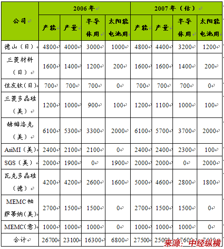 2006-2007年世界多晶硅各主要生产厂家的生产状况 单位:吨/年