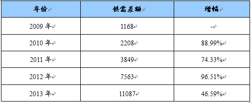 2009——2013年我国极细同轴电缆供需差额预测 单位:km