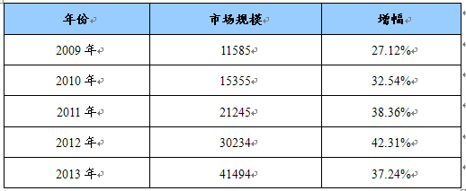 2009——2013年极细同轴电缆市场规模预测 单位:km