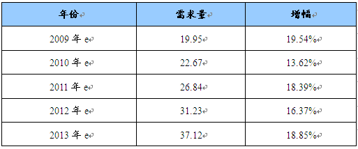 2009-2013年我国番茄酱产品需求量及增幅预测表