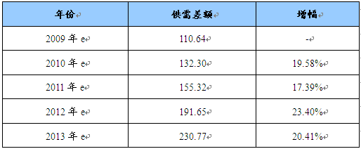 2009-2013年我国番茄酱产品供需差额及增幅预测表