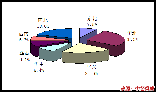 1、华北地区依靠雄厚的技术实力,排在首位。2008年的产量占全国的28.3%。