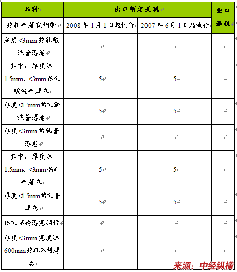 2008年我国钢铁产品出口暂定关税调整对照表
