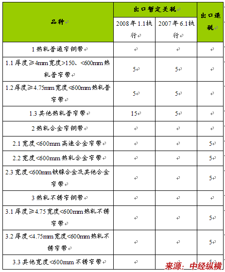 由于07年国家加强了对钢铁 行业 的宏观调控,对钢铁产品出口进行严格控制,使得带钢出口难度加大。从5月份开始,带钢出口逐月下降,到年尾,带钢出口普遍低于进口量,对国内市场形成进一步的压力。下半年,市场有传言,发改委准备将带钢的出口退税再将2个百分点,后因钢材市场极度低靡,而推迟到明年施行,对带钢市场又是一个打击。