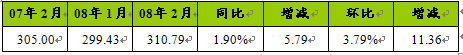 2008年2月份国内热轧窄带产量为310.79万吨,同比增加1.9%,同比增产5.79万吨,环比增长3.79%,环比增长11.36万吨;继1月产量大幅回调后,2月份热轧窄带产量小幅回升,但整体2月份热轧带钢市场资源仍将维持吃紧局面,有利于后期行情大幅持续高位平稳运行。