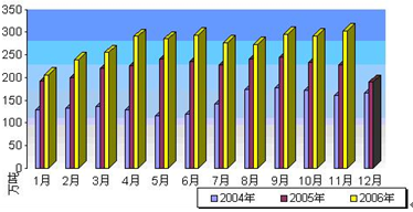 2007年以来国内带钢生产呈现大幅增长态势,截止到10月份,热轧窄带累计生产3298.16万吨,同比增长13.80%。05年基本呈不断增长态势,其中07年9月份带钢产量达到月产最高记录244.9万吨,日均产量也达到最高的5.05万吨。10月份受市场影响,产量有所下降,环比降幅为10%。