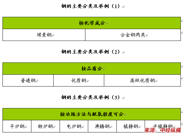 沸腾钢、镇静钢和半镇静钢:按脱氧程度和浇注制度不同区分。