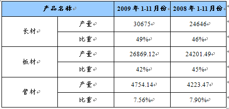 2009年,政策导向使市场需求发生变化,产品结构发生变化。1-11月份,长材产量比重为49%,较上年增加3%;板材为42%, 较上年减少3%;管材为7.56%,较上年持平。从钢材消费结构看,铁道用材、大型型钢、中小型材、棒材、钢筋、线材等均增长20%以上,如2009年仅铁路建设投资消费长材2000万吨,从趋势看,随着工业化、城镇化步伐加快,钢铁产品这种消费结构还将持续。
