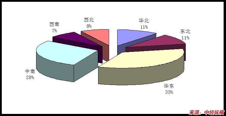 在有机无机复合肥施用方面,我国以华东地区所占比重最大,约占全国总量的35%,其次是中南地区,占28%。