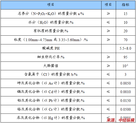 中华人民共和国国家质量监督检验检疫总局发布的G B 18877 2002有机-无机复混肥料标准对有机无机复混肥料要求外观:颗粒状或条状产品,无机械杂质;有机—无机复混肥料应符合下表的要求: