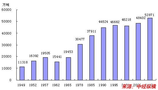 1949年我国粮食产量只有11318万吨,人均209公斤;1978年粮食总产量缓慢增长到30477万吨,人均产量增加到319公斤。改革开放以后,国家对农业的强力支持和农业科技的进步使粮食产量进入快速增长期,1984年超过4亿吨,1996年超过5亿吨,2008年达到52871万吨,与1949年相比,粮食产量增长3.7倍,人均产量增长91%;棉花产量1949年只有44.4万吨,1978年升至217万吨,2008年达749万吨,与1949年相比,增长15.9倍,人均产量增长5.9倍;油料产量1949年只有256万吨,1978年发展到522万吨,2008年达2953万吨,比1949年增长10.5倍,人均产量增长3.7倍;糖料产量1949年只有283万吨,1978年为2382万吨,2008年迅猛发展到13420万吨,与1949年相比,增长46.4倍,人均产量增长18.4倍。肉类、水果和水产品的迅速增长则反映了人们生活水平从量的满足到质的追求的变化过程。猪牛羊肉类产量1952年只有339万吨,人均5.9公斤,1978年产量865万吨,人均9.0公斤,2008年产量5337万吨,人均增加到40.3公斤;水果产量1949年120万吨,人均2.2公斤,1978年产量657万吨,人均6.9公斤,2008年产量19220万吨,人均145.1公斤;水产品产量1949年44.8万吨,人均0.8公斤,1978年产量465万吨,人均4.9公斤,2008年产量4896万吨,人均37.0公斤。