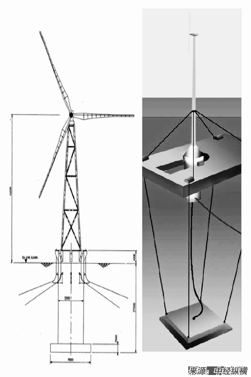 主体支撑结构浸于水中,通过缆索与海底的锚锭连接,该形式受波浪干扰较小,可以支撑3~6MW、旋翼直径80m的大型风机。