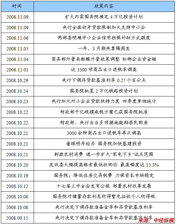 11月9日,国务院常务会议宣布对宏观经济政策进行重大调整,财政政策从“稳健”转为“积极”,货币政策从“从紧”转为“适度宽松”,同时公布了今后两年总额达4万亿元的庞大投资计划,明确要求“出手要快、出拳要重、措施要准、工作要实”。