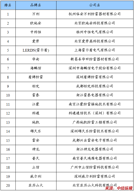 全球防雷厂商在中国市场前二十品牌