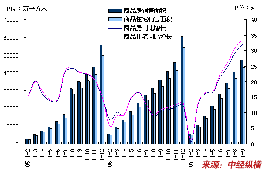 2005年-2007年9月全国商品房销售面积及同比增长情况