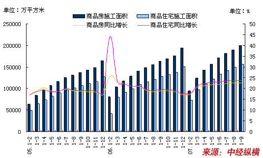 2005年-2007年9月全国商品房、商品住宅施工面积及同比增长