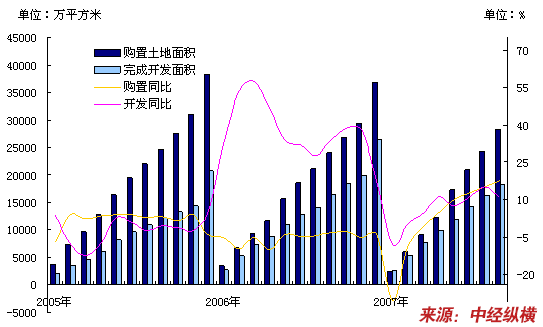 2005年-2007年9月全国房地产企业土地购置与开发面积同比增长
