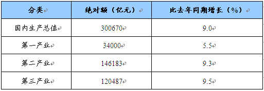 初步核算,全年国内生产总值300670亿元,比上年增长9.0%。分季度看,一季度增长10.6%,二季度增长10.1%,三季度增长9.0%,四季度增长6.8%。分产业看,第一产业增加值34000亿元,增长5.5%;第二产业增加值146183亿元,增长9.3%;第三产业增加值120487亿元,增长9.5%。