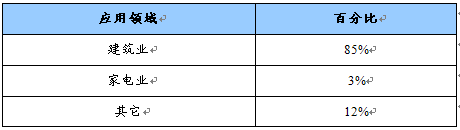 我国彩色涂层钢板主要用于建筑领域,汽车、家电等领域。其中建筑领域是彩钢涂层钢板最大的应用市场,产品用量超过80%。目前在汽车、家电等领域彩钢涂层板的应用正逐渐发展,市场份额还不是很高。
