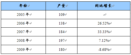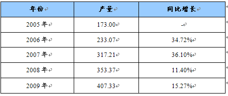 2005-2009年我国彩色涂层钢板产量增长统计表 单位:万吨