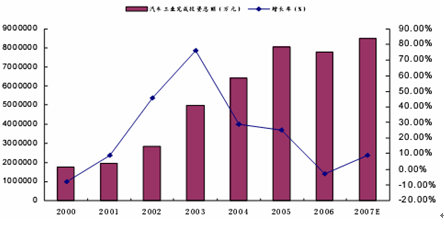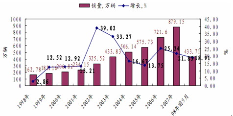 我国汽车工业经历了几年的平稳增长之后,2007年再度呈现出较快发展的趋势。汽车生产888.24万辆,同比增长22.02%,比上年净增160.27万辆;销售879.15万辆,同比增长21.84%,比上年净增157.60万辆。产销衔接情况良好,各月汽车产销率均超过90%,其中5月份、8月份、9月份和12月份产销率均超过100%。值得关注的是,我国汽车 行业 产销连续9年增幅保持两位数快速增长。其中,在2000年销量突破200万辆后,2002年、2003年、2004年、2006年和2007年,每年销量均跃升到新的百万辆级规模,2007年的销量水平更是比2003年翻了一番。2007年,我国轿车全年销量472.7万辆,同比增长23.5%,前十位品牌占有率超过30%。