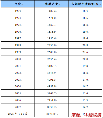 2000年以前,线材占钢材产量的比重一直稳定在20%左右。2001年以后,随着世界制造业向我国的转移,我国板管带材产销所占的比重逐步增加,建筑钢材所占比重逐年下降。2001-2007年,我国线材产量由3109.7万吨增加到8038.2万吨,占钢材产量的比重由19.8%下降到14.2%。