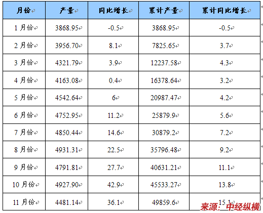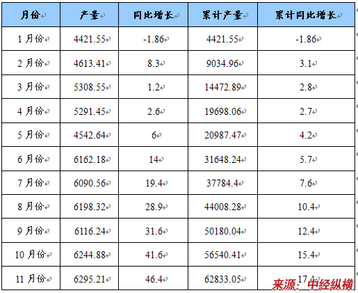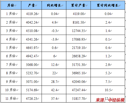 2009年1至11月份粗钢产量统计表 单位:万吨