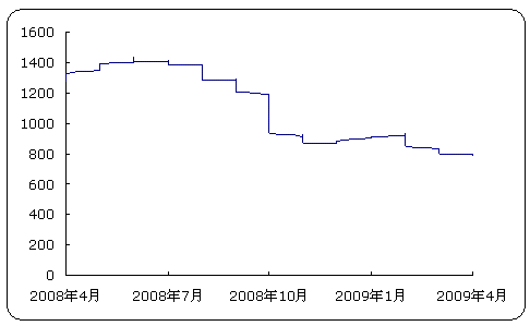 由于产量过剩、下游需求不振以及出口萎靡等因素影响,钢材价格在进入2月份以来不断下跌,下图为2008年4月份以来宝山钢市综合指数成交均价指数。从下图中可以看出金融危机全面爆发以来,我国钢铁产品价格急速下滑。