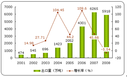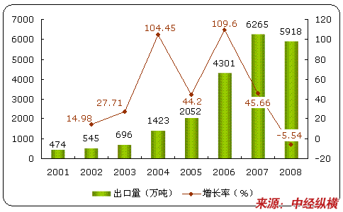 在世界经济不景气的宏观环境下,发达国家经济出现整体衰退,发展中国家经济减速,对钢材需求均出现下降。同时钢铁领域的贸易保护主义愈演愈烈,这些都成为阻碍我国钢材出口的重要因素。下图为2001-2008年我国钢材出口量及其增长率。从下图中可以看出我国钢材出口在连续6年正增长之后,在2008年首次出现负增长。