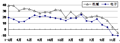 2007年—2008年11月以来机械、电子 行业 出口交货值分月增速(%)