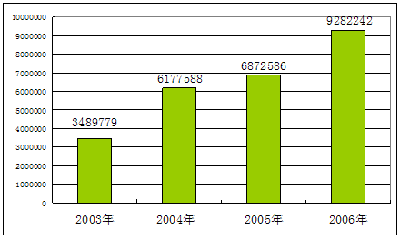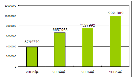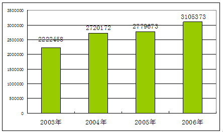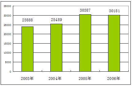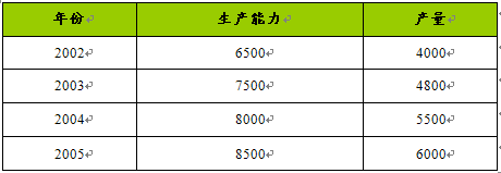 BOPET薄膜由于前几年发展势头过猛,生产能力骤增,2006年仅有少量生产线上马,如常州钟恒公司的新型双点拉伸,采用ABC三层共挤、双螺杆挤出、薄膜宽幅达到8.2m、线速度400m/min的先进技术。其他的生产能力都是前几年大量引进形成的,2006年生产能力为50万吨,产量仅为32.5万吨,在没有新的生产能力的情况下,市场仍然是供过于求。