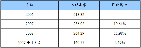 我国精纺羊绒面料市场刚刚启动,这一面料还没有被广大消费者普遍认可,远远达不到对羊绒的认知,因此市场开发推广变得尤为迫切,2008年我国精纺羊绒面料市场需求达到264.29万米,同比增长11.98%,2009年1-8月产量达到160.77万米,同比增长2.69%。