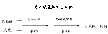 以氯乙酸与氨水为原料,在乌洛托品催化剂作用下制得。先将催化剂溶解在氨水中,在良好搅拌下滴加氯乙酸,投料结束后,升高温度,保温一段时间,再降温至一定温度时,用乙醇或甲醇重结晶两次,就可以得到纯度为95%左右的甘氨酸。