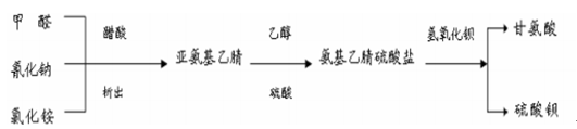 将甲醛水溶液、氰化钠和氯化铵混合后在低温下进行反应,反应结束后加入醋酸使亚氨基乙腈析出,然后溶解在乙醇内,加入硫酸后转化为氨基乙腈硫酸盐,最后加入化学计量的氢氧化钡生成硫酸钡和甘氨酸。该工艺同样存在生产成本高、产品质量差和环境污染严重的缺点。