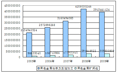 2005-2009年黑色金属冶炼及压延加工业黑色金属矿采选业销售收入对比