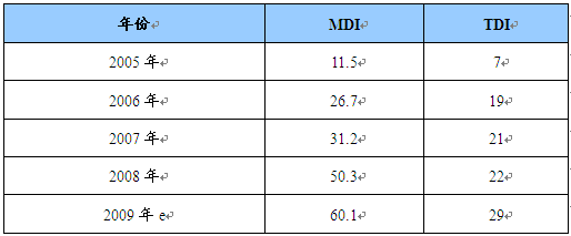 2008年,我国TDI和MDI需求分别增长了约5.4%和13.4%,达到39.3万吨和71.6万吨。2009年元旦后,国内聚合MDI价格开始回升,从年前11000元/吨以下,普遍恢复到11500元/吨左右。与此同时,其他聚氨酯原料,如纯MDI、TDI的价格也止住了下跌,呈现出稳步回升的走势。与此同时,建筑节能的MDI消费市场在2008年2万~3万吨的基础上,分别于2009年与2010年有望增至近10万吨及30万吨以上。