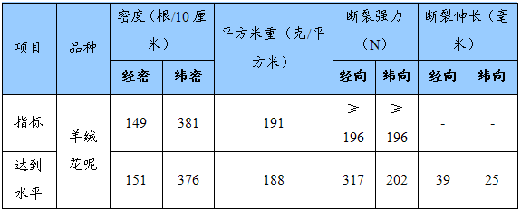 呢面细腻、纹路清晰、花型大方,配色协调,光泽自然柔和,手感滑幡、悬垂性好,达到了预期的设计效果。