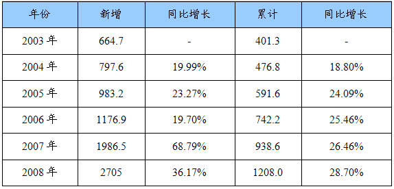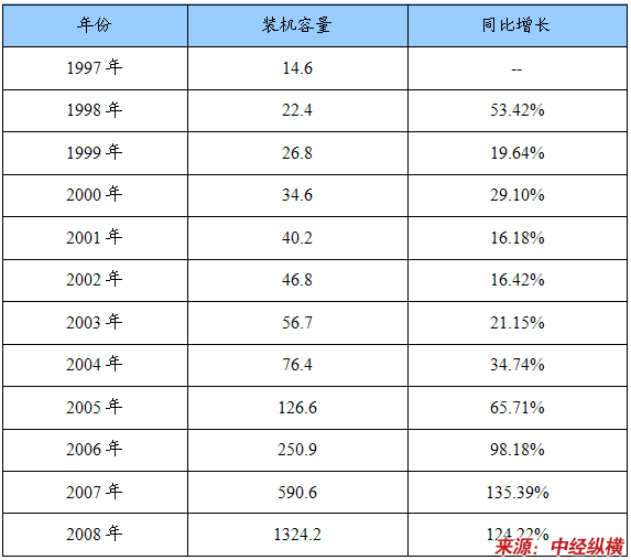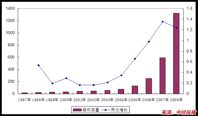 2008年,中国新增装机容量达到625万千瓦,使得中国的总装机容量再次翻番达到1200万千瓦,提前两年实现了国家发改委提出了2010年实现风电装机1000万千瓦的 规划 发展目标。为了应对金融危机,中国政府把发展风电作为改善能源结构的重要手段和新的经济增长点。最近召开的全国能源工作会议上,国家能源局也明确提出,我国风能资源丰富,具有良好的开发利用前景。要促进我国风电产业健康发展,加强风电建设管理,不断完善政策,坚持以风电特许权方式建设大型风电场,推动风电设备国产化,逐步建立我国的风电产业体系。按照“融入大电网,建设大基地”的要求,从09年起,国家将力争用10多年时间在甘肃、内蒙古、河北、江苏等地形成几个上千万千瓦级的风电基地。